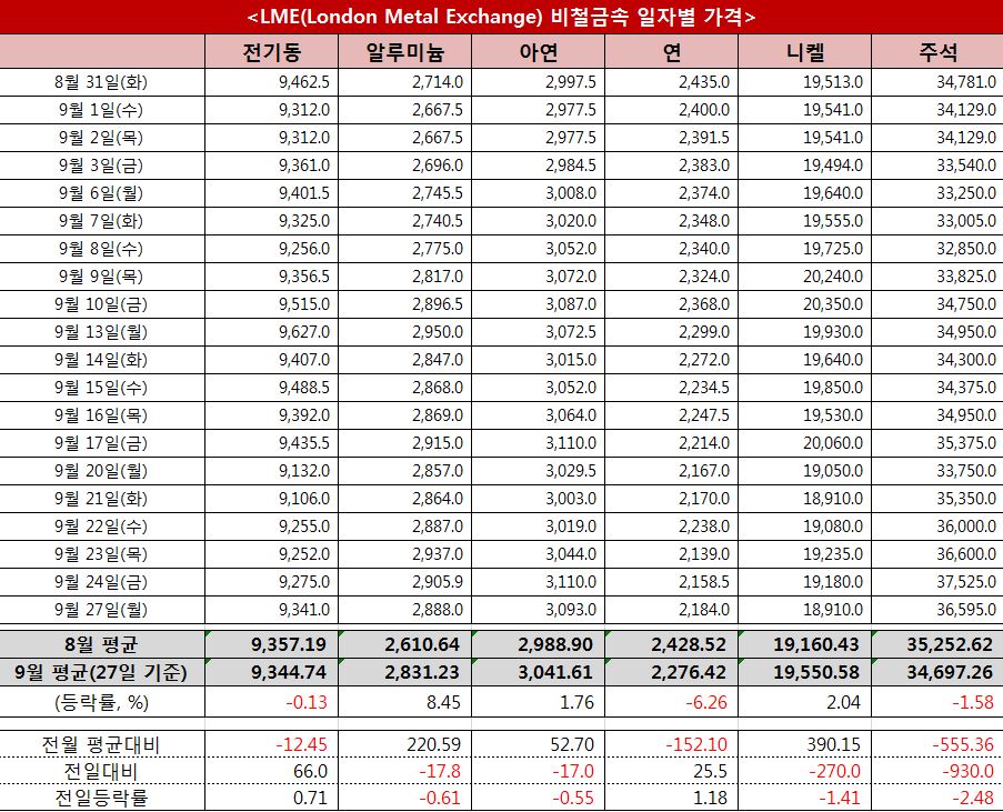 니켈 가격은 중국의 전력사용 제한이 스테인리스스틸 생산에 영향을 미칠 것이라는 우려에 다시 하락했다. 스테인리스스틸을 포함한 중국의 조강생산은 중국 정부의 규제강화 영향에 8월에 전년동월 대비 13.2% 감소한 것으로 집계됐다.