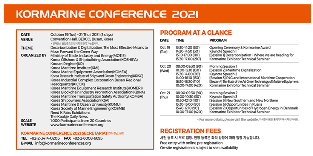 국내 최대 조선·해양 콘퍼런스인 코마린콘퍼런스(Kormarine Conference 2021)가 처음으로 해외에서 개최될 예정이다. 러시아 블라디보스토크에서 열리는 이번 콘퍼런스에는는 한국조선해양기자재공업협동조합(KOMEA)과 한국선급, 한국선주협회, 선박해양플랜트연구소, 한국조선해양기자재연구원, 한국조선해양플랜트협회 등 조선과 조선기자재 관련 단체 15곳이 참여한다.