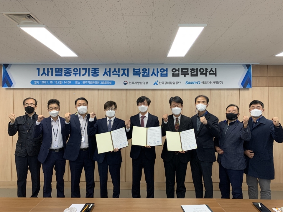한국광해광업공단(사장 황규연)은 원주지방환경청, 삼표자원개발과 멸종위기종의 대체 서식지 조성 및 개체 증식을 위한 서식지 복원사업 협약식을 체결했다고 19일 밝혔다.