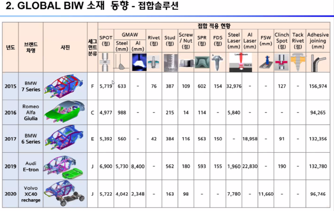 아울러 그는 “미래차가 개발되면서 기존 차체골격의 점용접과 함께, 이종소재 체결을 위한 접착제·SPR(Self-piercing Riveting)·레이저용접·가스메탈아크용접(GMAW) 적용이 늘어나고 있다”라며 “부품 조립시 철강(Steel)과 알루미늄(판재, 압출재, 주조재), 탄소섬유 강화 플라스틱(CFRP) 특성과 개단면, 폐단면에 따른 접합 솔루션의 중요도가 증가하고 있다”라고 전했다.