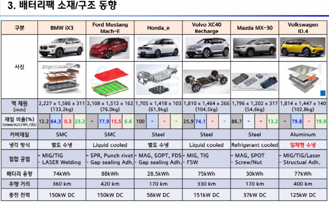 손성만 이사는 전기차 패터리팩 부문에 대해서도 소재 적용 경향을 설명했다. 그는 “상판 커버는 스틸이 대세로 쓰이지만 알루미늄 등의 기타 소재 사용도 늘어가는 추세”라며 “소재의 다양성이 이뤄지는 중”이라고 말했다. 그는 “하부 프로텍트 패널은 스테인리스를 포함한 철강과 알루미늄, SMC(Sheet Molding Compound/복합성형 재료) 혼형되고 있는 추세”라고 덧붙였다.