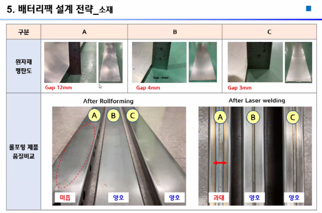 발표 후반부에서 손성만 이사는 패터리팩 부문에서의 원소재 코일 평탄도 중요성을 강조했다. 손 이사는 “원소재의 코일 평탄도는 사각재 튜브 측면 평탄도에 영향을 준다”라며 “코일의 평탄도가 불량하면 사각재 튜브 롤 포밍 양끝단에서 불균형 접전이 발생하여 레이저용접의 변형이 증가함에 따라 용접 불량이 발생하기 쉬워진다”라고 지적했다.