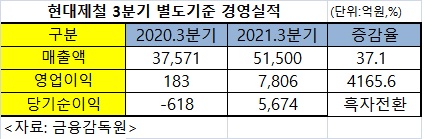 지난 9월 협력사 파업에 따른 제품 출하 지체 영향으로 판매량이 다소 줄었지만 글로벌 철강시황 강세 흐름에 적극 대응해 큰 폭의 수익성 개선을 이어가고 있는 모습이다.