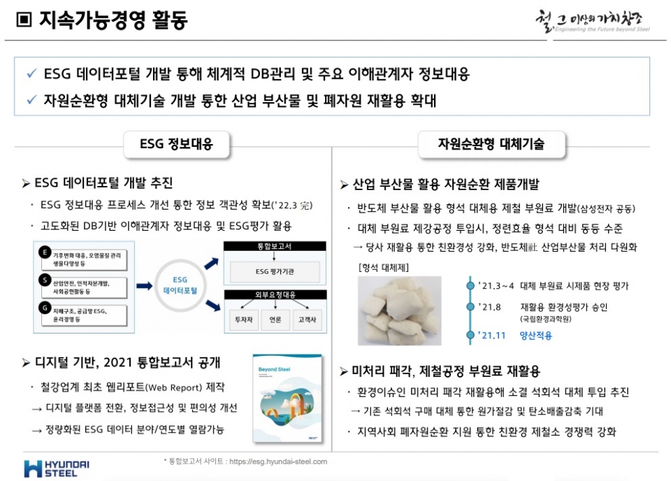현대제철은 ESG 데이터 포털 개발을 통해 체계적인 데이터베이스(DB) 관리와 주요 이해관계자 정보 대응에 힘쓰고, 자원순환형 대체 기술 개발을 통한 산업 부산물 및 폐자원 재활용 확대에 노력하고 있다고 전했다.