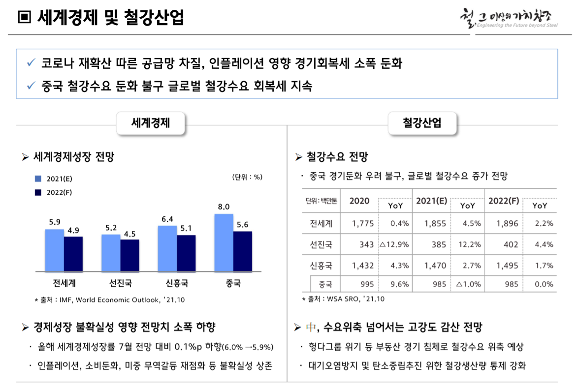 현대제철은 국제통화기금(IMF) 등의 자료를 인용하며 올해 세계 경제 성장률이 5.9%(추정), 내년 세계 경제 성장률이 4.9%(전망)를 기록할 것이라고 밝혔다.