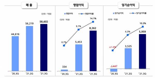 현대제철은 별도기준 실적 개선과 함께 국내외 종속법인 수익성 개선으로 3분기 연결손익이 증가했다. 연결기준 매출액은 전년 동기 대비 31.3% 증가한 5조8,602억원, 영업이익은 2374% 증가한 8,262억원을 달성했다. 영업이익률 역시 14.1%로 두 자릿수 이익률을 기록했다. 분기순이익도 5,959억원을 기록하며 흑자전환에 성공했다.