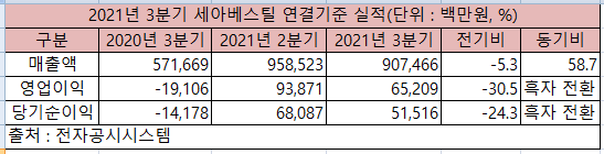 세아베스틸의 3분기 별도기준 매출액은 5,439억5,100만원으로 전분기 대비 5.2% 감소했고, 전년 동기 대비로는 83.6% 증가했다. 3분기 영업이익은 351억9,300만원으로 전분기 대비 41.4% 감소했고, 당기순이익은 301억7,000만원으로 전분기 대비 33.1% 감소했다. 영업이이과 당기순이익 모두 전년 동기 대비로는 흑자 전환했다.