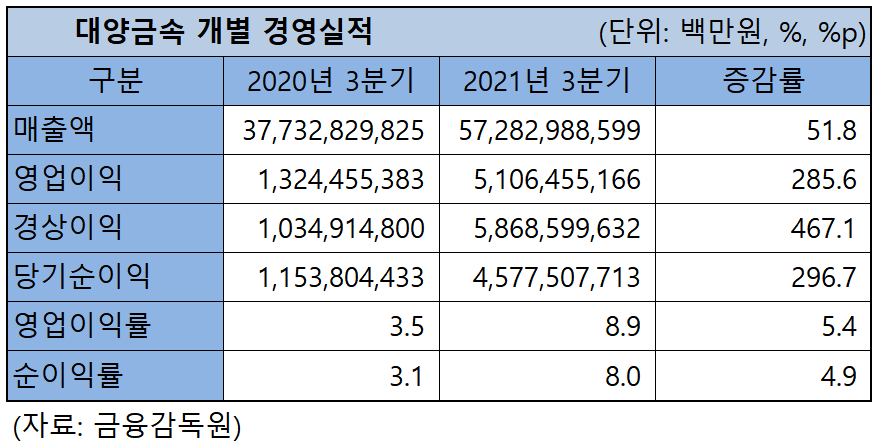 지난 8일, 대양금속은 2021년 3분기 영업이익이 전년 동기 대비 286% 급증한 51억원(영업이익률 8.9%)을 기록했다고 공시를 통해 밝혔다. 이는 회사의 최근 5년간 분기별 매출 중 최고 실적이다.