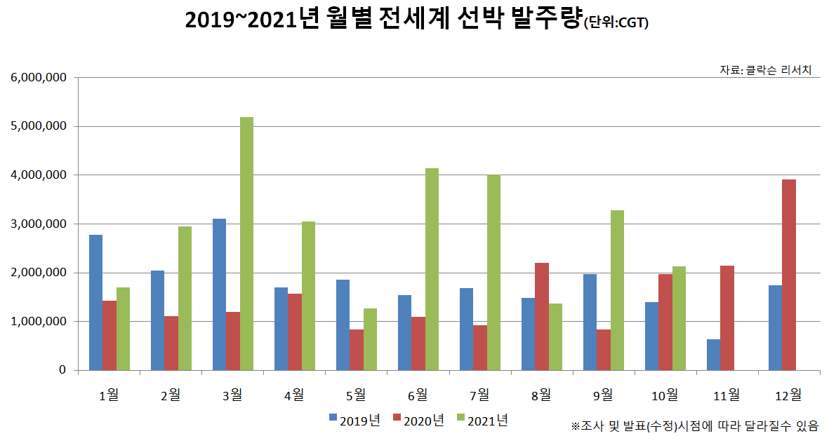 국내 조선사들은 지난 9월을 전후해 연간 수주 목표를 조기 달성한 바 있다. 이는 국제적인 친환경 해상운송 규제와 폐선 교체 수요 증가, 각국의 코로나19 경기부양책에 따른 물동량 수요 증가 등이 원인으로 꼽히고 있다.