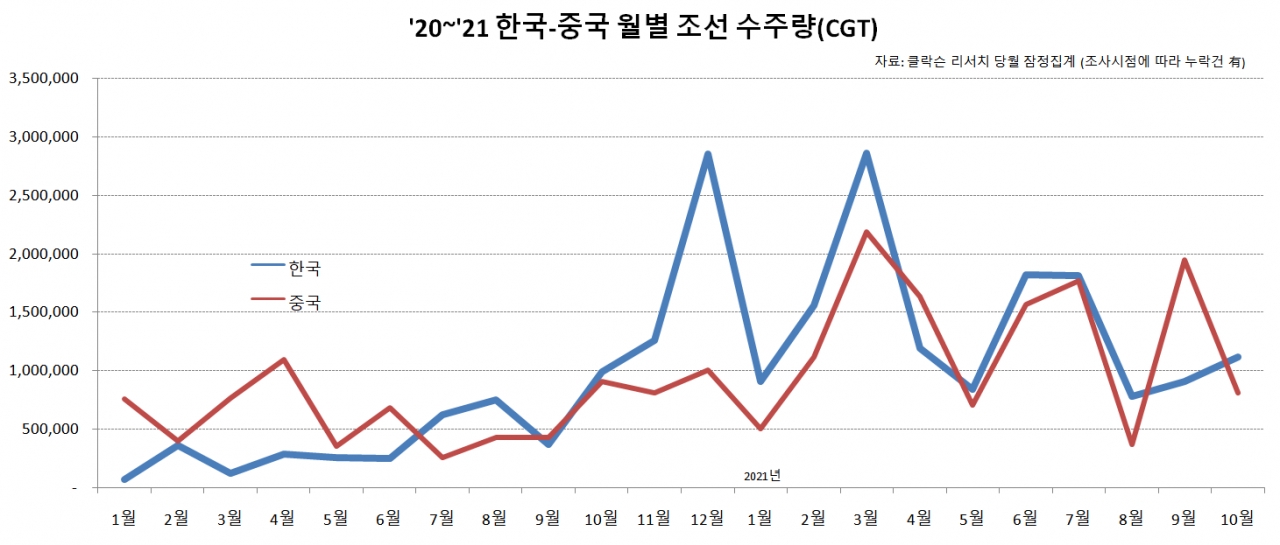 조선·해운분석기관인 클락슨 리서치에 따르면 지난 10월 한국 조선업계의 선박 수주량은 112만CGT(표준화물선 환산 톤수)를 기록했다. 10월 세계 선박 발주량 213만CGT의 절반 이상(52%)을 독차지했다. 경쟁국인 중국은 81만CGT, 점유율 38%로 2위에 머물렀다.
