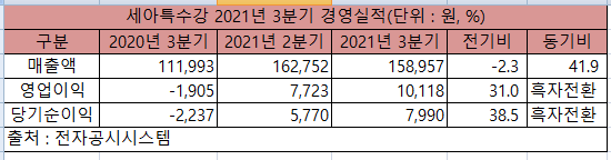 이는 여름 휴가와 추석 연휴로 조업일수가 감소한 데다 장마로 건설경기가 침체되고, 반도체 수급난으로 인해 자동차산업 생산이 감소하면서 주력 제품인 냉간압조용 선재와 마봉강 판매가 감소했기 때문이다.