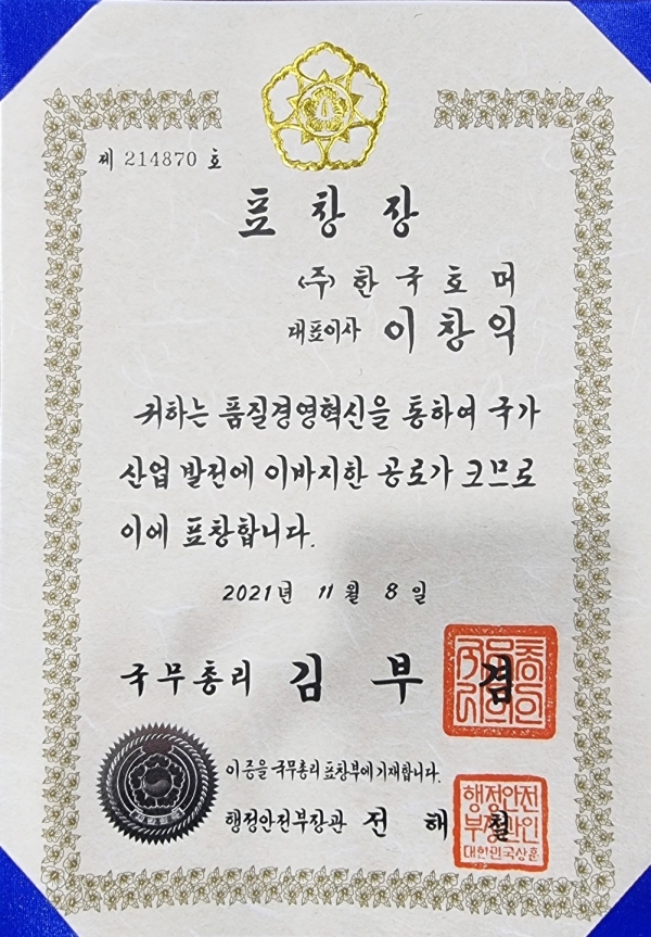 한국호머 이창익 대표가 제47회 국가품질경영대회에서 ‘내진성능을 강화한 내진 M-BAR’ 시스템 개발을 통한 국내 건축산업의 품질경쟁력 향상에 기여해 국무총리 표창을 수상했다.