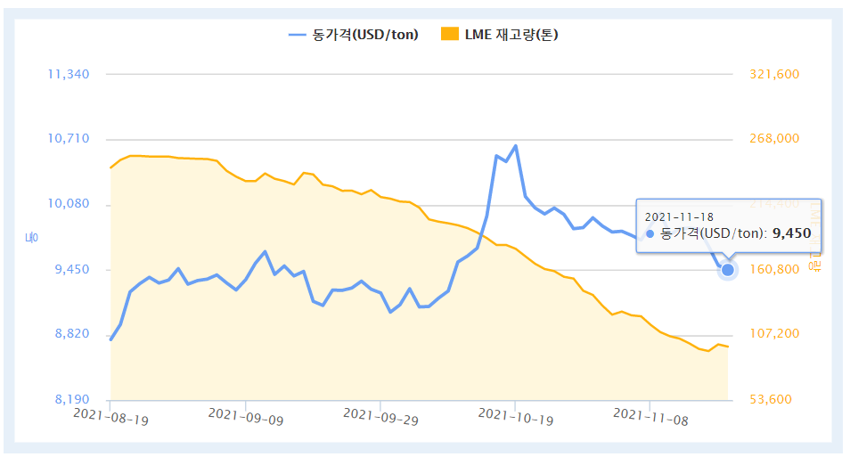 지난 18일 런던금속거래소(LME)에서 거래된 전기동 현물가격은 전일대비 45달러 떨어진 톤당 9,450달러를, 3개월물 가격은 85달러 하락한 9,410달러를 각각 기록했다. 전일 LME 창고 재고가 11거래일 만에 증가하면서 재고 급감 사태가 마무리 되는 듯한 모습을 보이면서 전기동 가격이 크게 떨어졌고 이날 런던 오전장까지 영향을 미치면서 약세 움직임을 보였다.