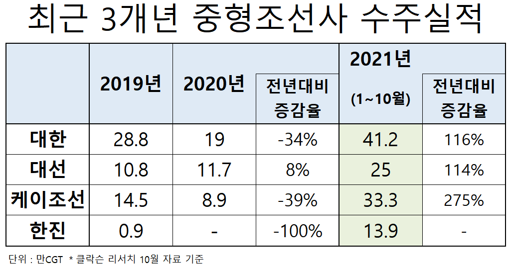 실제로 대한조선과 대선조선, 케이조선(前STX조선해양), 한진중공업 등 중형조선사 4개사는 올해 누적 수주 실적이 각각 전년 대비 2배 이상 증가했다.