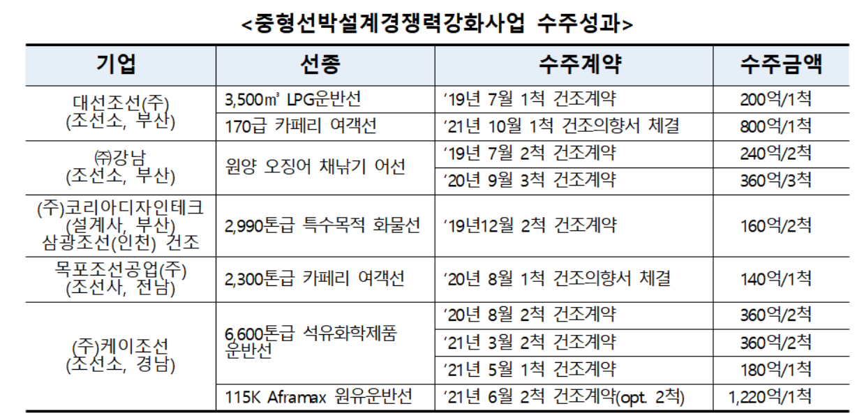 산업부는 지난 4년간 중형선박설계경쟁력강화사업 등으로 중소형 조선업계를 지원하고 있다. 중형선박설계경쟁력강화사업은 정부의 조선산업 위기 극복 및 경쟁력 강화를 위한 중형조선사를 지원 사업(5개 기업, 7개 프로젝트를 지원)으로 중소형 조선업계의 설계역량 강화와 기술인력 유지, 협력체계 구축 등을 돕고 있다.