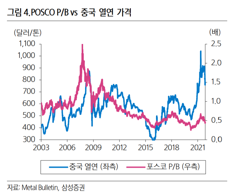 삼성증권 백재승 연구원(방관석 연구원 참여)은 “철강업종의 현재 벨류에이션은 과거 낮은 ROE(자기자본이익률)로의 회귀가 전제된 수준”이라며 “이는 공급과잉이 지속되어 철강 가격 하락 폭이 클 것이라는 가정에 기반했기 때문”이라고 설명했다.