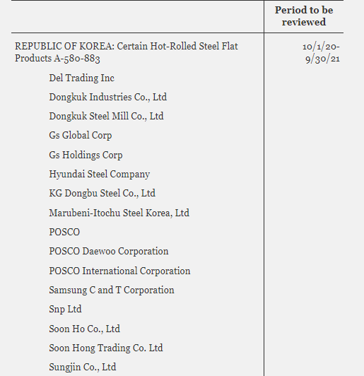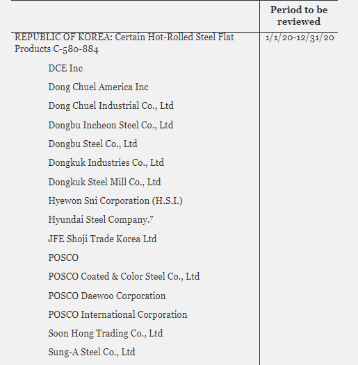 29일, 미국 상무부는 정부 공식 문서를 통해 한국과 일본, 대만, 태국, 멕시코 등에 대한 정기 일몰 재심을 실시할 계획이라고 밝혔다. 한국과 관련해서는 열연강판 품목 조사 대상 기업이 선정됐다. 이번 한국산 열연강판의 조사대상기간(POR)은 반덤핑 조사가 2020년 10월 1일~2021년 9월 30일, 상계관세 조사가 2020년 1월 1일~ 2020년 12월 31일이다.
