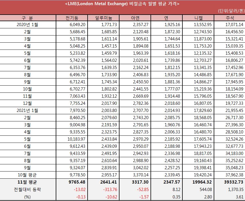 지난 11월 런던금속거래소(LME)에서 거래된 비철금속 평균가격이 품목에 따라 등락이 엇갈렸다. 전력난으로부터 촉발된 공급 이슈에 일제히 큰 폭으로 상승했던 10월과는 달리 중국의 석탄 가격 급락에 동반해 알루미늄 가격이 크게 떨어진 반면에 수급 불균형 우려가 다시 부각된 니켈과 주석 가격은 다시 큰 폭으로 상승했다.