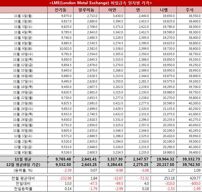 지난 6일 런던금속거래소(LME)에서 거래된 비철금속 현물 오피셜 가격은 전기동이 톤당 9,526달러(+13), 알루미늄 2,600.5달러(-47.5), 아연 3,224.5달러(-99.5), 연 2,235달러(+4), 니켈 1만9,980달러(-310), 주석 3만9,400달러(-800)를 각각 기록했다.