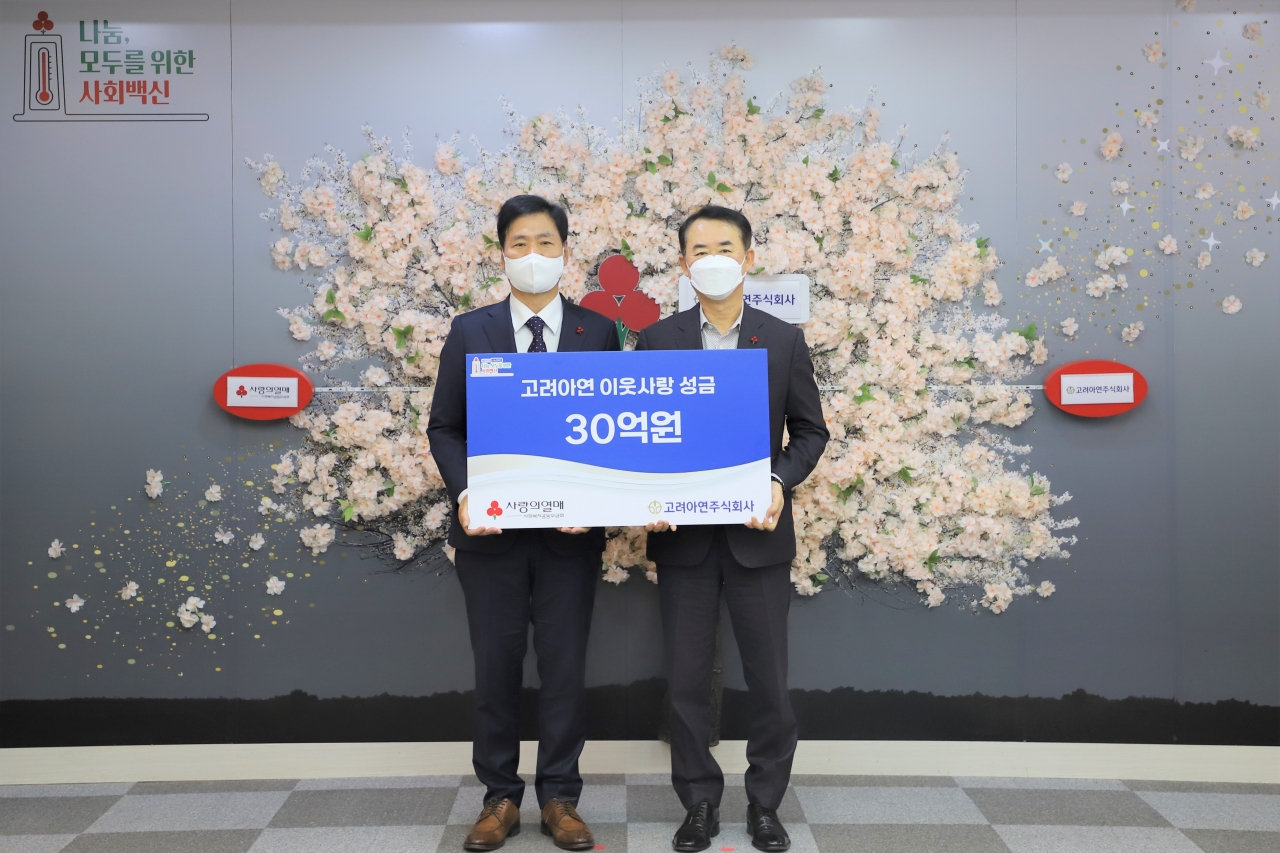 고려아연은 2021년 12월 10일(금) 오전 사랑의 열매 사회복지공동모금회에 이웃사랑 성금 30억 원을 기부하며 ‘희망2021나눔캠페인’에 동참했다. 이날 기부금 전달은 노진수 대표이사와 사랑의열매 김상균 사무총장, 김경희 사회공헌본부장을 비롯한 임직원이 참석한 가운데 이뤄졌다.