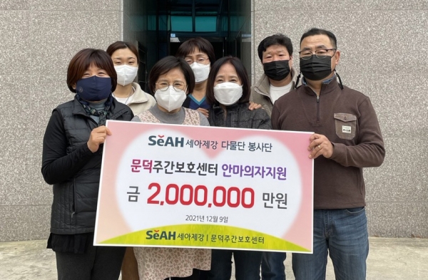 종합강관 제조업체 세아제강의 봉사단체인 다물단 이명철 단장과 이경봉 사무국장은 지난 9일 포항시 문덕주간보호센터를 찾아 노인분들의 건강관리를 위한 안마의자 구입비로 200만원을 전달했다.