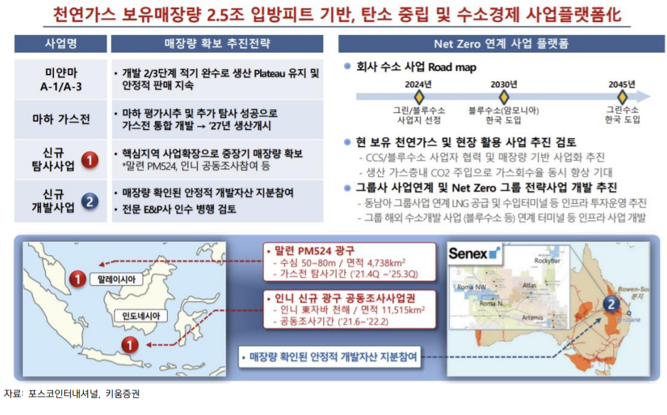 키움증권 이종형 연구원(김소정 참여)은 포스코인터내션널이 호주 동부 육상 가스전 생산 및 개발을 목적으로 호주 6위 E&P 업체인 Senex Energy사(社)의 지분 50.1%를 취득해 인수를 확정했다고 설명했다. 이 연구원은 “해당 인수를 통해 천연가스 대체 매장량 추가 확보 및 에너지 전환사업 추진 플랫폼화가 기대된다”라며 “향후 그룹사의 액화천연가스(LNG)와 가스전을 활용한 탄소 포집 및 블루소수 생산에도 활용된다면 주가에도 긍정적인 영향이 있을 것으로 판단한다”라고 밝혔다.