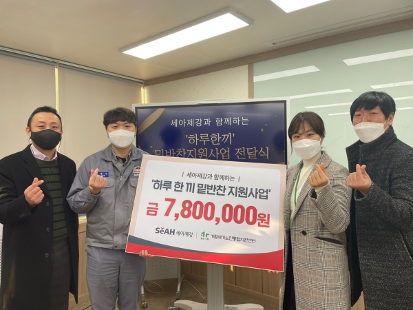이를 바탕으로 세아제강은 경제적 곤란으로 인해 절식과 결식의 위험이 있는 어르신들을 위하여 사회복지법인 열린가람에 1560명분의 밑반찬 지원금을 전달하였다. 어르신들에게 밑반찬을 지원하는 “하루 한 끼 사업” 은 경제적 어려움으로 불가피하게 절식하는 어르신 및 지역 내 소외된 어르신의 작은 밥상 위에 따뜻한 온기를 담은 한 끼를 제공하는 사업이다.