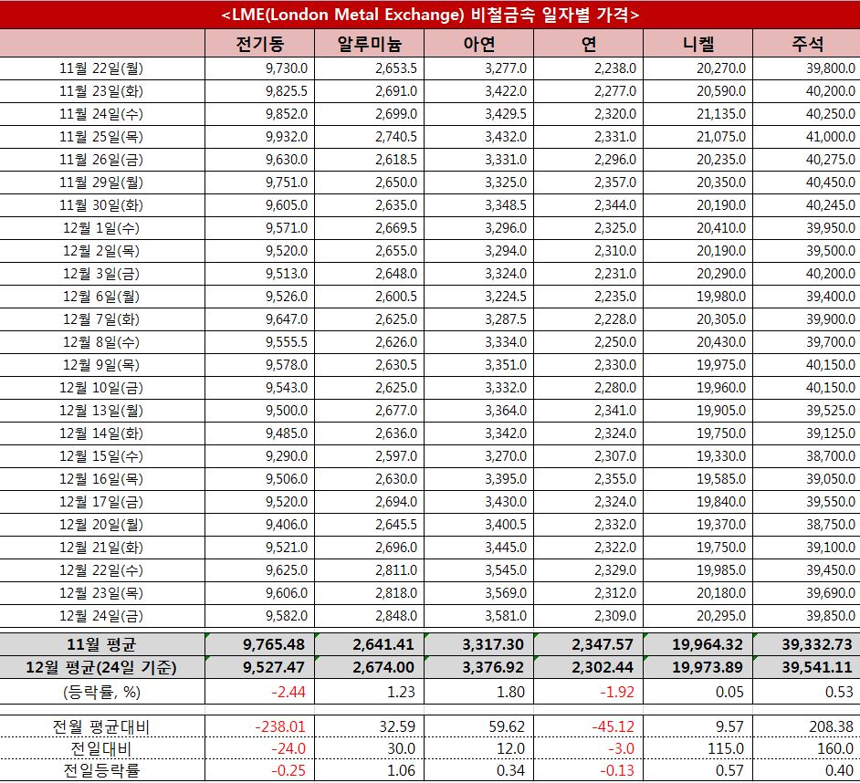 지난 24일 런던금속거래소(LME)에서 거래된 비철금속 현물 오피셜 가격은 전기동이 톤당 9,582달러(-24), 알루미늄 2,848달러(+30), 아연 3,581달러(+12), 연 2,309달러(-3), 니켈 2만295달러(+115), 주석 3만9,850달러(+160)를 각각 기록했다.