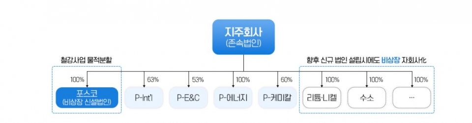 포스코가 지주회사 전환을 앞두고 철강 자회사 상장시 주주총회의 특별 결의를 거치는 요건을 정관에 명시했다. 포스코의 지주회사 체제는 지주사인‘포스코홀딩스’를 상장사로 유지하며, 지주회사는 미래 신사업 발굴, 그룹 사업 및 투자 관리, 그룹 R&D 및 ESG 전략 수립 등을 맡는 구조다. 철강 사업회사 ‘포스코’는 물적 분할되어 지주회사가 100% 소유하게 되며, 철강 사업회사뿐만 아니라 향후 지주사 산하 신규 설립되는 법인들도 상장은 지양한다는 방침이다.