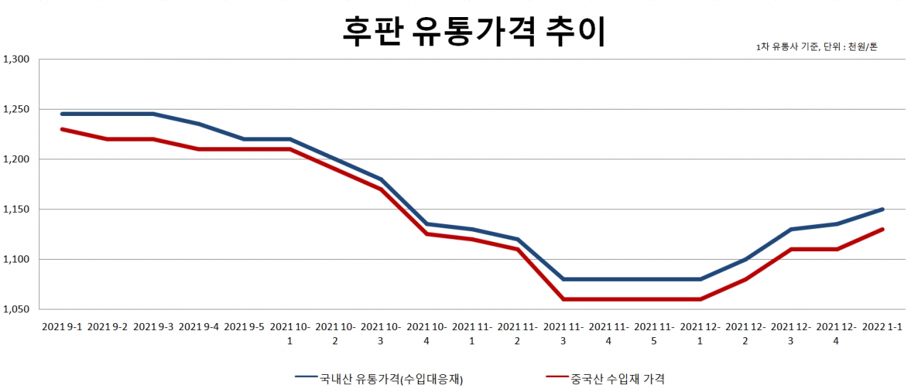 후판 유통업계에 따르면 1월 초중순 포스코 수입대응재(GS강종)는 톤당 115만원 전후 수준(1차 유통사 기준)에 거래됐다. 지난해 12월 초순보다 톤당 6만~7만원 상승한 것으로 평가된다. 포스코 정품(SS275) 가격도 톤당 117만원으로 이전보다 크게 뛰었다.
