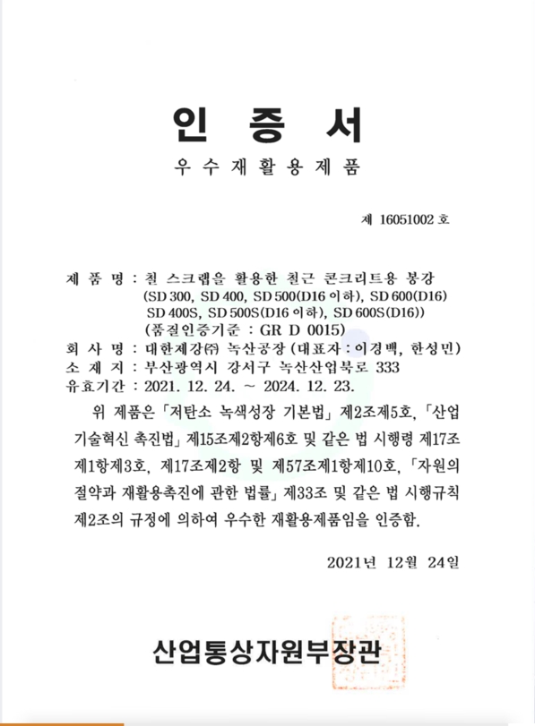 대한제강과 와이케이스틸이 최근 산업통상자원부 산하 국가기술표준원에서 우수재활용 제품(GR 인증, Good Recycled Product)을 받았다.