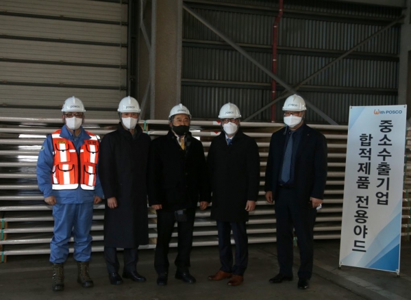 중소수출기업 합적제품 전용야드를 방문한 구자열 한국무역협회 회장(사진 중앙)과 김광수 포스코터미날 사장(오른쪽에서 두 번째), 천시열 포항제철소 부소장(왼쪽에서 첫 번째), 서수민 DKC 대표(왼쪽에서 두 번째), 김병유 한국무역협회 본부장(오른쪽에서 첫 번째)