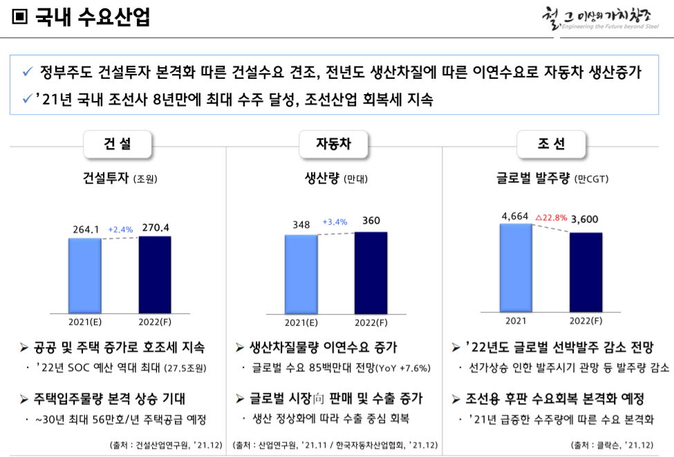 현대제철은 또한 자동차 생산 수요에 대해서도 긍정적인 기대감을 밝혔다. 현대제철은 올해 자동차 글로벌 수요는 85백만 대(전년 대비 7.6% 증가)로 증가할 것으로 전망하며, 지난해 반도체 부족으로 인해 정상적으로 이뤄지지 못했던 자동차 산업은 올해 들어 상황이 개선될 것으로 내다보았다. 또한 각국의 경기 부양 대책 등으로 자동차 시장의 판매 및 수출이 회복될 것으로 전망했다.