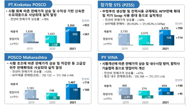 먼저 크라카타우포스코는 시황 회복에 따른 판매 가격 상승 및 수익성 기반으로 신속한 수요대응으로 사상최대 실적을 달성했다. 장가항 STS는 중국 정부의 생산량 및 전력사용 규제에도 WTP 판매 확대 및 저가 스크랩 사용 증대로 실적개선에 성공했다.