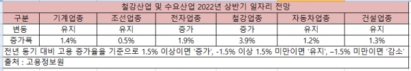 우선 철강업종은 국내 수요 강세, 수출 확대, 수입산 유입 축소 등 수급 여건 변화로 생산이 증가할 것으로 전망된다. 철강산업 내수는 2022년 상반기 일부를 제외한 대부분 품목의 수요가 확대되면서 전년 동기 대비 3.1% 증가하며, 수출은 전 세계 철강 수요 확대, 물류 환경 개선으로 전년 대비 2.9% 증가할 것으로 예상된다. 수입은 2022년 최대 수입 대상국인 중국의 자국시장 우선 공급의 영향으로 전년 대비 4.7% 감소할 것으로 전망된다. 이에 따라 철강 업종의 고용은 전년 동기 대비 증가할 것으로 예상된다.