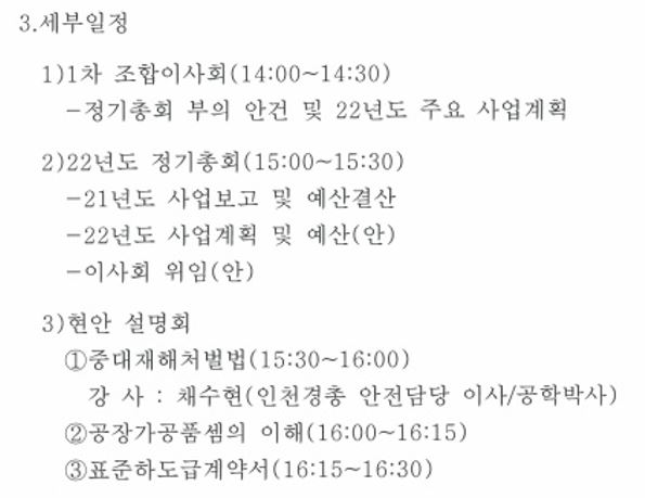 아울러 현안 설명회를 개최해 최근 가장 논란 이슈인 중대재해처벌법에 관한 강의를 진행한다. 강의는 채수현 인천경영자총협회 안전담당 이사가 진행할 예정이다.