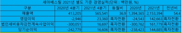 2월 10일 세아베스틸의 공시에 따르면 2021년 매출액은 2조1,533억9,400만원으로 전년 대비 54.4% 증가했다. 영업이익은 1,426억6,300만원, 당기순이익은 1,448억8,500만원으로 모두 전년 대비 흑자전환했다.