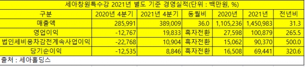 2021년 세아창원특수강의 별도 기준 매출액은 1조4,509억8,300만원으로 전년 대비 31.3% 증가했고, 영업이익과 당기순이익은 각 1,008억7,900만원, 694억4,100만원으로 전년 대비 무려 265.5%, 320.6%나 증가했다.