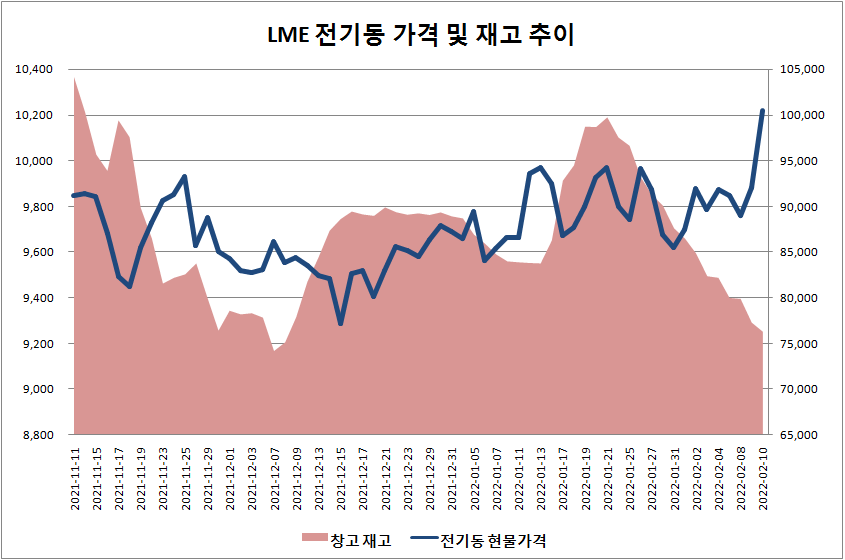 런던금속거래소(LME)에서 거래되는 전기동 판매가격이 3개월 여만에 톤당 1만 달러대에 재진입했다. 수요 전망이 낙관적인 상황에서 주요 거래소 재고 감소로 인해 공급부족에 대한 우려가 커지고 있다. 또한 인플레이션이 쉽게 잡히지 않을 수도 있다는 예상도 전기동 가격 상승에 영향을 미친 것으로 보인다.