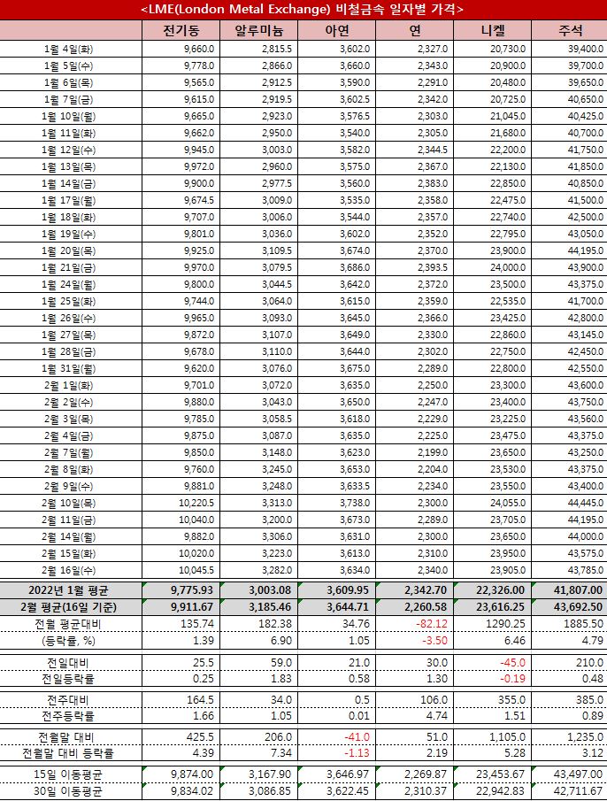 지난 16일 런던금속거래소(LME)에서 거래된 비철금속 현물 오피셜 가격은 전기동이 톤당 1만45.5달러(+25.5), 알루미늄 3,282달러(+59), 아연 3,634달러(+21), 연 2,340달러(+30), 니켈 2만3,905달러(-45), 주석 4만3,785달러(+210)를 각각 기록했다.