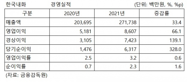 이로써 한국내화의 2021년 매출액 영업이익률은 3.2%를 기록해 2020년의 2.5% 대비 0.6%p 증가했으며, 매출액 순이익률은 2.3%를 기록해 2020년의 0.7% 대비 1.6%p 증가했다.