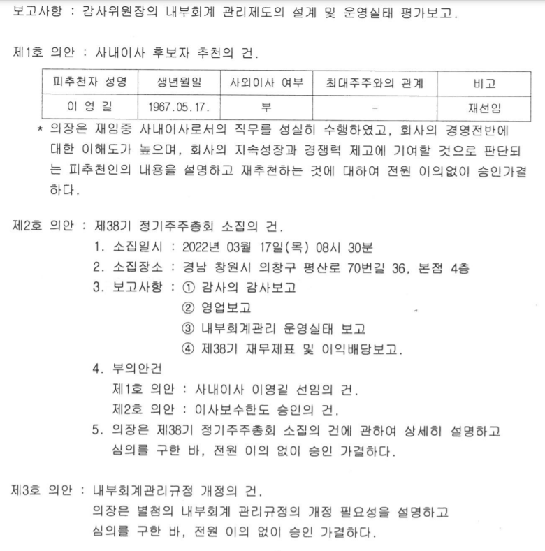 지난 16일, 삼현철강 이사회는 오는 3월 17일, 경남 창원시 본사 4층 회의실에서 제38기 정기 주주총회 개최하는 안건을 가결했다.