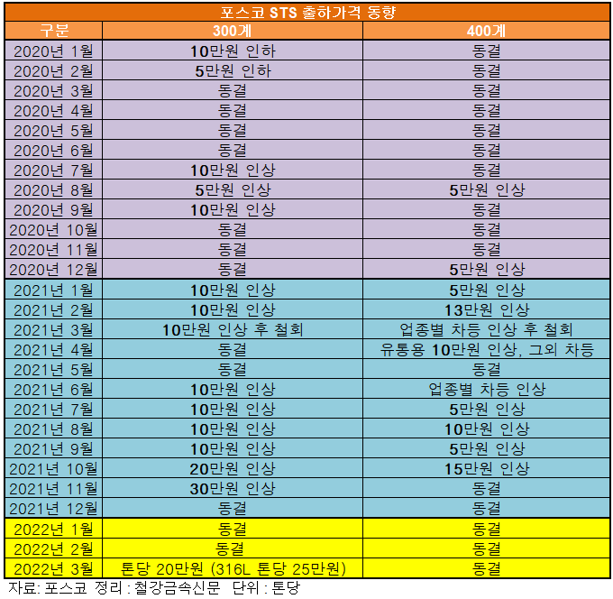 18일, 포스코는 3월 STS 강판 300계 출하 가격을 톤당 20만원 인상한다고 밝혔다. STS 316L 출하 가격도 전월에 이어 톤당 5만원 추가 인상했다. 회사 지난해 12월부터 올해 2월까지 국내 STS 시장 가격 안정을 위해 출하 가격을 동결(300계 기준)한 바 있다.