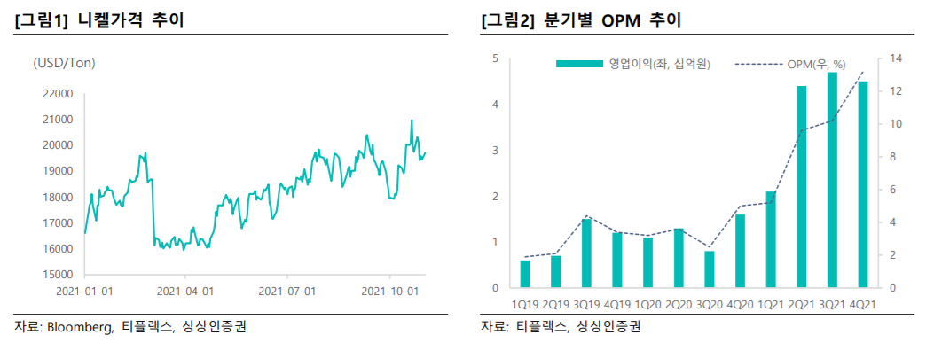 아울러 이 연구원은 “티플랙스가 주 사업으로 영위하는 스테인리스는 강도가 높고, 철에 니켈과 크롬을 혼합해 녹슬지 않는 특징을 갖고 있어 내마모성·내부식성을 바탕으로 여타 산업의 기초 소재로 통용된다”라며 “주요 소재인 니켈 가격 상승으로 판매 가격 인상과 이익률 개선이 예상되는 데, 러시아와 우크라이나 분쟁 우려와 전기차 시장의 급성장에 따라 이러한 기조는 중장기적으로 지속될 전망”이라고 주장했다.