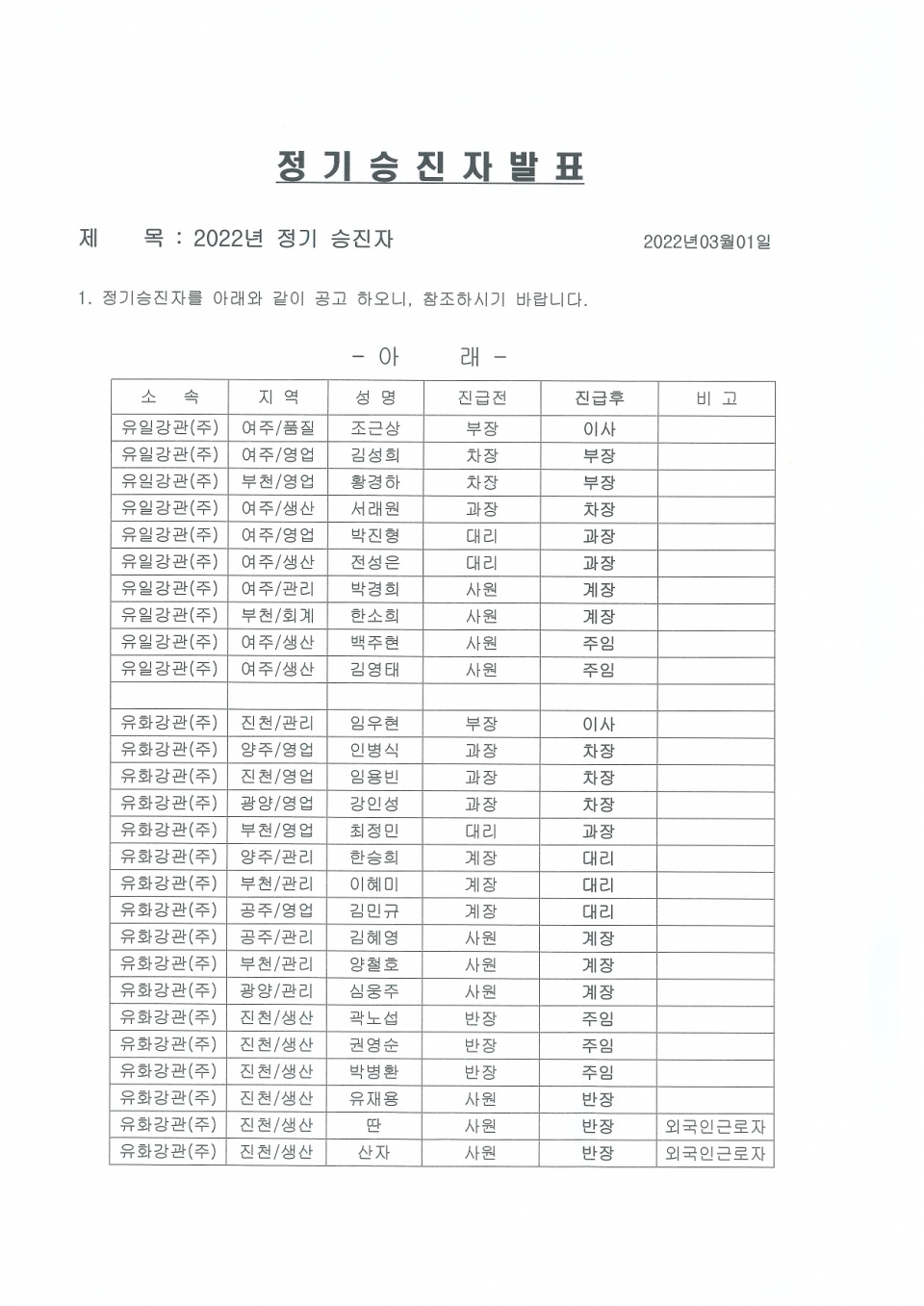 강관 제조업체 유일강관, 유화강관이 2021년 정기 인사를 단행했다. 이하 내용은 다음과 같다. ■ 2022년 정기 진급자 명단 박재철 기자 parkjc@snmnews.com 다른 기사 보기 관련기사 ‘원자재價 급등’ 구조관 3월 가격 인상 배관용강관부터 구조관까지 3월 추가 인상 실현되나 5인치 구조관, 건축 현장 적용 늘어 구조관 업계, “추가 가격 인상으로 수익성 확보해야” 구조관 제조업계, 3월 추가 가격 인상 검토 석영에스텍, 사업 다각화로 신성장동력 확보 하이스틸, 주주총회 개최 구조관 업계, HR 소재 부족 현상 심화 최영희 코스 대표, 지스트에 발전기금 전달 대도중공업, 김천시에 기부금 500만원 기탁 물류비 증가에 파렛트용 강관 수요 감소 구조관 제조업계, 절단 방식 교체로 ‘품질향상’에 집중 강관업계, 글로벌 물류 대란 지속 우려 (강관) 구조관 업계, 소재 부족에 대안 마련 총력 저작권자 © 철강금속신문 무단전재 및 재배포 금지
