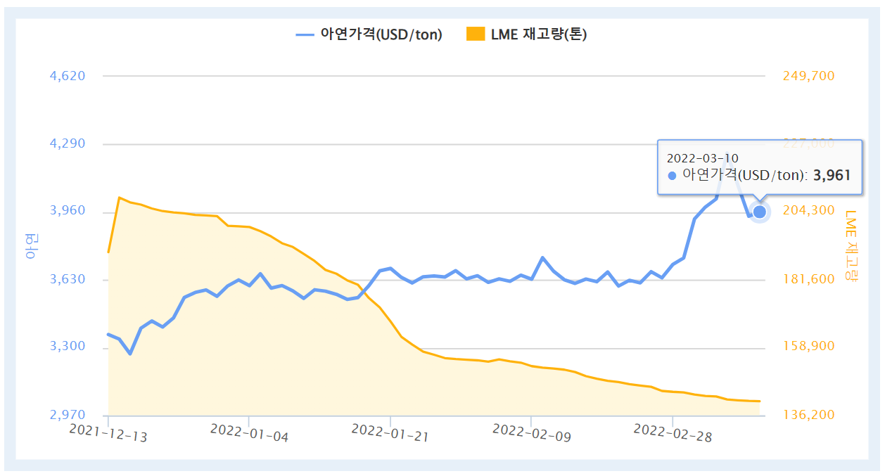 지난 10일 런던금속거래소(LME)에서 거래된 아연 현물가격은 전일대비 21달러 상승한 톤당 3,961달러를, 3개월물 가격은 14달로 오른 3,975달러를 각각 기록했다. 장중 현물가격은 3,972.5달러까지 상승했다가 그동안 가격 상승동력으로 작용했던 천연가스 가격이 하락했고 글로벌 경기 둔화 우려가 커지면서 가격이 하락한 것으로 풀이된다.