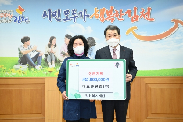 경북 김천시 소재 대도중공업(대표이사 장락기·백계자)은 지난 11일 지역의 어려운 이웃을 위해 김천복지재단에 500만원의 기부금을 전달했다.