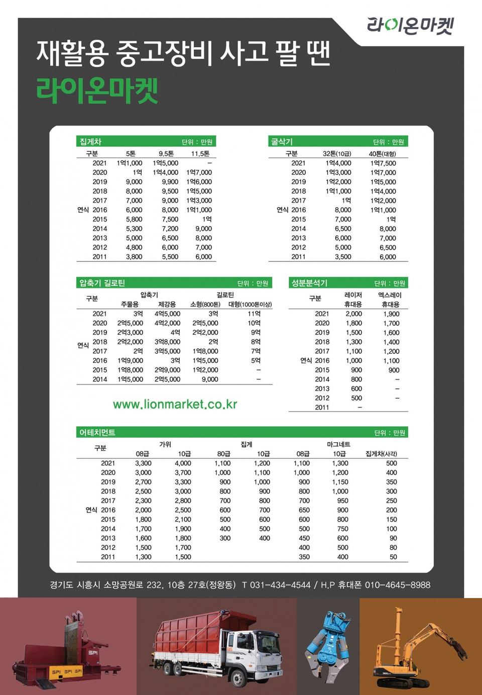 한편 라이온마켓 홈페이지를 방문해 회원 가입을 하면 매월 업데이트된 중고 시세를 휴대폰 문자로 무료로 받아 볼 수 있다. 라이온마켓은 철스크랩, 파지, 폐기물 등에 사용하는 재활용 중고장비를 온라인상에서 쉽고 빠르게 거래할 수 있는 중고장비 직거래 플랫폼이다.