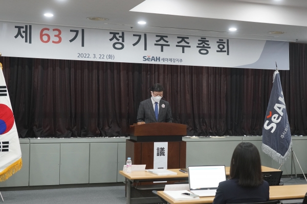 한국사회복지회관 대회의실에서 열린 세아제강지주 제63기 정기주주총회에서 재무제표 (이익잉여금 처분계산서 포함) 및 연결재무제표 승인의 건을 처리했다. 감사로는 김선용 現 선명회계법인 고문을 선임했다.