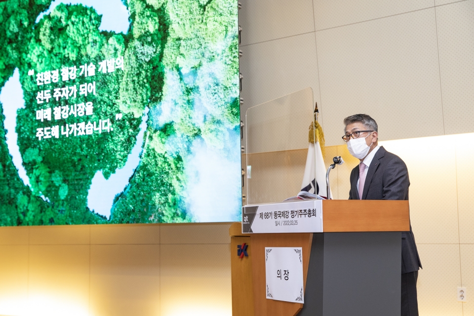 장 부회장은 영업보고를 통해 ‘Steel for Green’을 전략으로 친환경 철강 체제 전환을 선도하겠다고 밝혔다. 그는 “동국제강은 탄소 배출량 절감에 탁월한 ‘전기로’를 국내 최초로 도입한 회사다”라며, “친환경 시대에 적합한 강점을 가지고 있다”고 말했다. 그는 “전기로 기술 고도화, 친환경 컬러강판 생산공정 구축, 친환경 제품 확대 등 미래 철강 시장을 주도하겠다”고 강조했다.